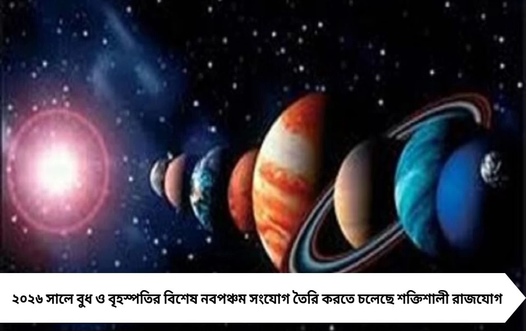 ২০২৬ সালে বুধ ও বৃহস্পতির বিশেষ নবপঞ্চম সংযোগ তৈরি করতে চলেছে শক্তিশালী রাজযোগ। এই বিরল জ্যোতিষ সংযোগের ফলে তিনটি রাশির জাতক-জাতিকাদের জীবনে অর্থ, সম্পত্তি, সাফল্য ও সুখের নতুন দরজা খুলতে পারে।