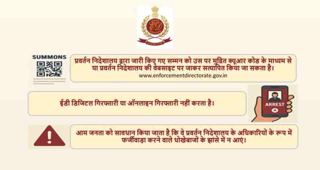 বিবৃতিতে আরও বলা হয়েছে যে ইডি কখনও ডিজিটাল বা অনলাইন অ্যারেস্ট করে না, তাই নাগরিকদের সতর্ক থাকার পরামর্শ দেওয়া হচ্ছে। অনলাইনে নিজেদের ইডি কর্মকর্তা পরিচয় দিয়ে প্রতারকদের ফাঁদে পা দেবেন না।