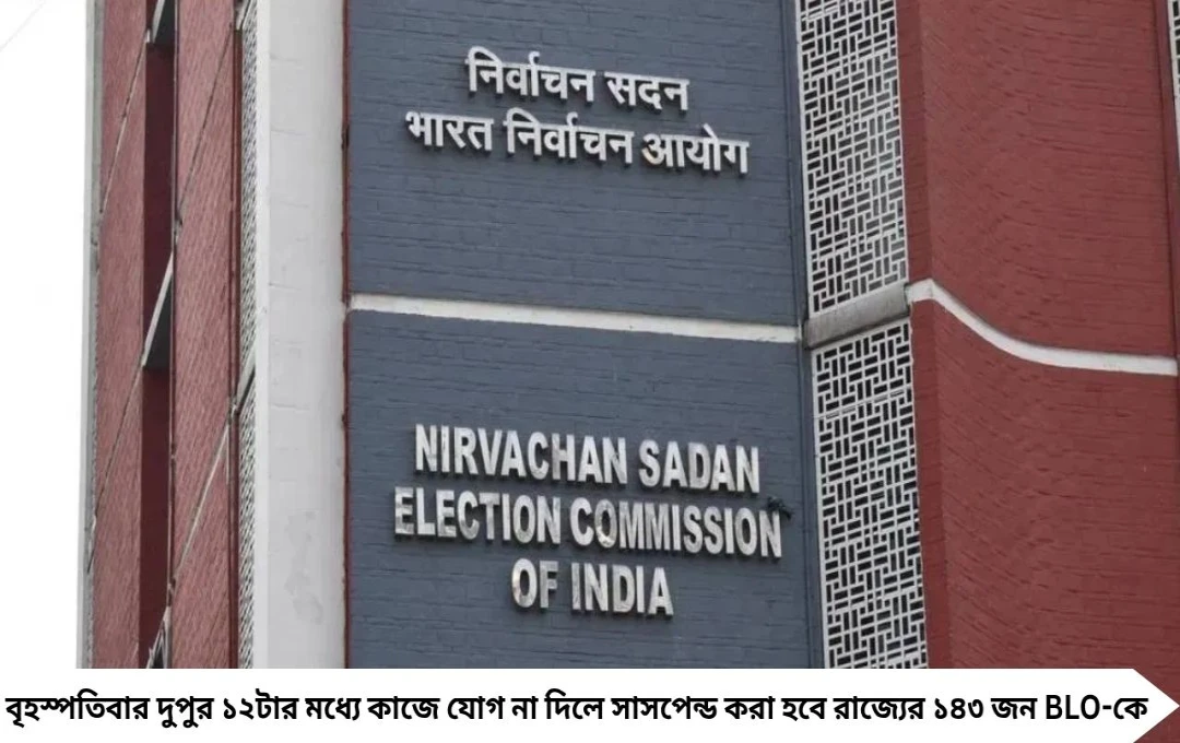 বৃহস্পতিবার দুপুর ১২টার মধ্যে কাজে যোগ না দিলে সাসপেন্ড করা হবে রাজ্যের ১৪৩ জন BLO-কে। জাতীয় নির্বাচন কমিশনের পক্ষ থেকে এমনই নির্দেশ গিয়েছে মুখ্য নির্বাচনী আধিকারিক মনোজ কুমার আগরওয়ালের কাছে। ভোট প্রস্তুতির কাজ দ্রুত সম্পন্ন করতেই এই কঠোর পদক্ষেপ বলে সূত্রের খবর।