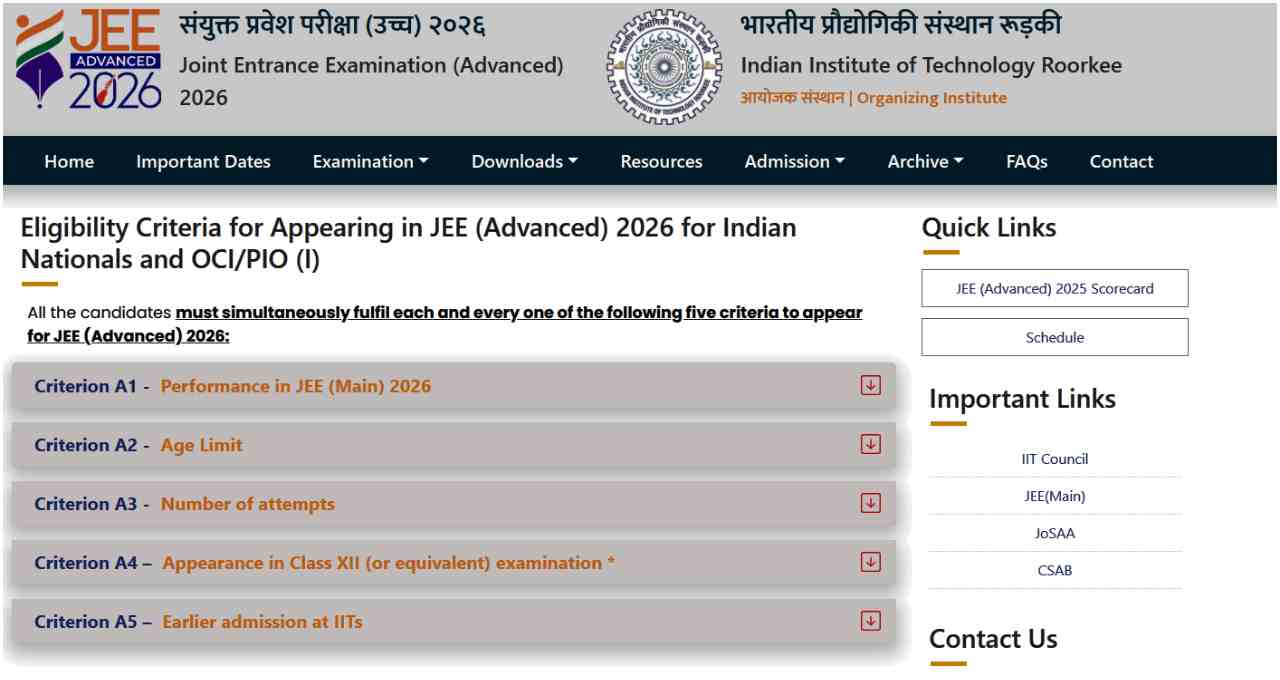 JEE Advanced 2026-এ অংশগ্রহণের জন্য শুধুমাত্র JEE Main স্কোর যথেষ্ট নয়। পরীক্ষায় বসতে হলে প্রার্থীদের নির্ধারিত যোগ্যতার সব শর্ত পূরণ করতে হবে, যার মধ্যে রয়েছে JEE Main 2026-এর ভিত্তিতে ক্যাটাগরি-ভিত্তিক সংরক্ষণ অনুযায়ী শীর্ষ ২.৫ লক্ষের মধ্যে থাকা, নির্ধারিত বয়সসীমার মধ্যে থাকা, সর্বোচ্চ চেষ্টা সীমা মেনে চলা এবং সাম্প্রতিক দুই বছরের মধ্যে পদার্থবিজ্ঞান, রসায়ন ও গণিতসহ দ্বাদশ শ্রেণি উত্তীর্ণ হওয়া।