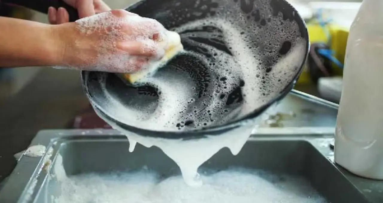 ঠান্ডা জলে ঘষাঘষি না করে প্রথমে একটি বড় পাত্রে হালকা গরম জল নিন। তাতে নোংরা বাসন কিছুক্ষণ ভিজিয়ে রাখুন। এতে তেল–মশলার দাগ নরম হয়ে যাবে। পরে ধোওয়া অনেক সহজ হবে।