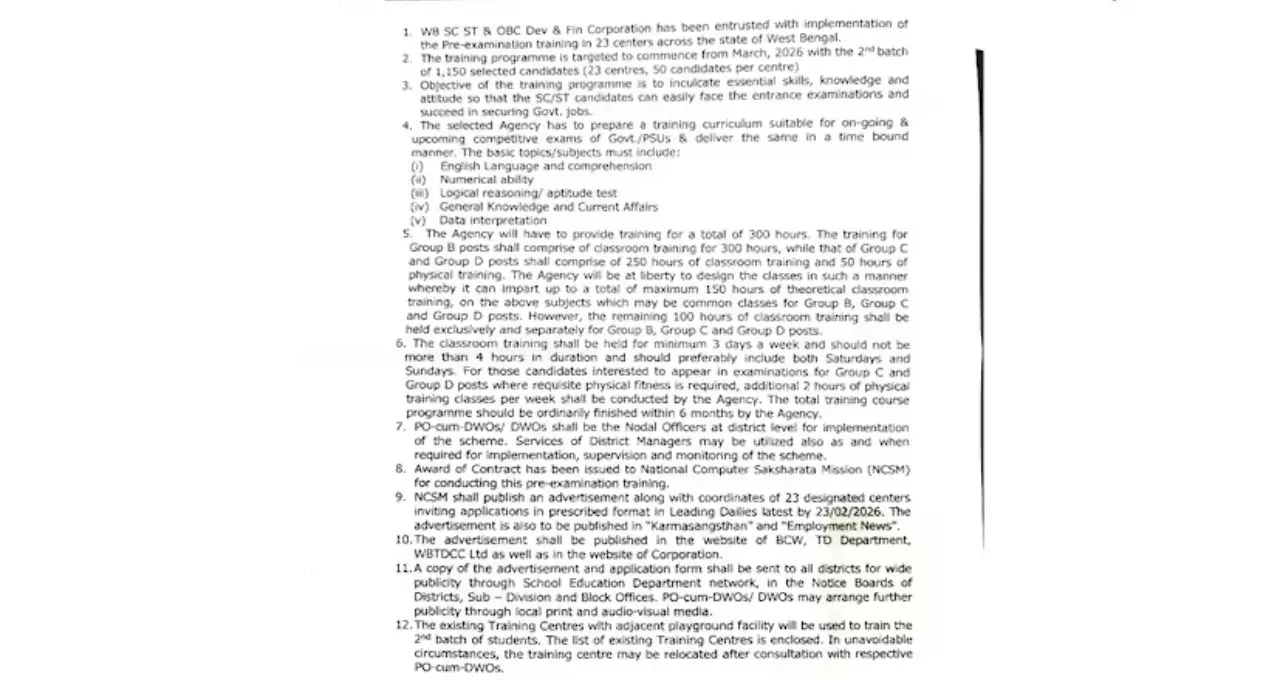 তপশিলি জাতি ও আদিবাসী সম্প্রদায়ভুক্ত যুবক-যুবতীদের জন্য বড় সুযোগ নিয়ে এল মালদহ জেলা প্রশাসন। সরকারি চাকরির প্রস্তুতির জন্য সম্পূর্ণ বিনামূল্যে বিশেষ প্রশিক্ষণ কর্মসূচি শুরু হচ্ছে। মোট ৫০ জন প্রার্থী স্ক্রিনিং পরীক্ষার মাধ্যমে নির্বাচিত হবেন। আবেদন চলবে ১০ মার্চ পর্যন্ত।