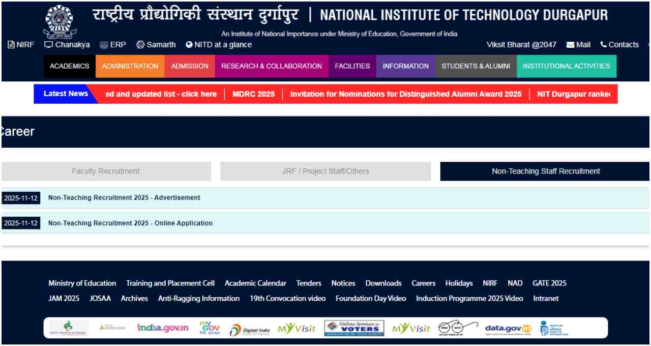 প্রার্থীরা NIT দুর্গাপুরের অফিসিয়াল ওয়েবসাইটে গিয়ে আবেদন করতে পারবেন। নিয়োগ বিভাগে “Non-Teaching Recruitment 2025” লিঙ্ক খুলে আবেদন ফর্ম পূরণ করতে হবে। সমস্ত নথি আপলোড এবং ফি পরিশোধ করার পর ফর্মটি জমা দিন এবং এর একটি প্রিন্ট নিজের কাছে রাখুন।