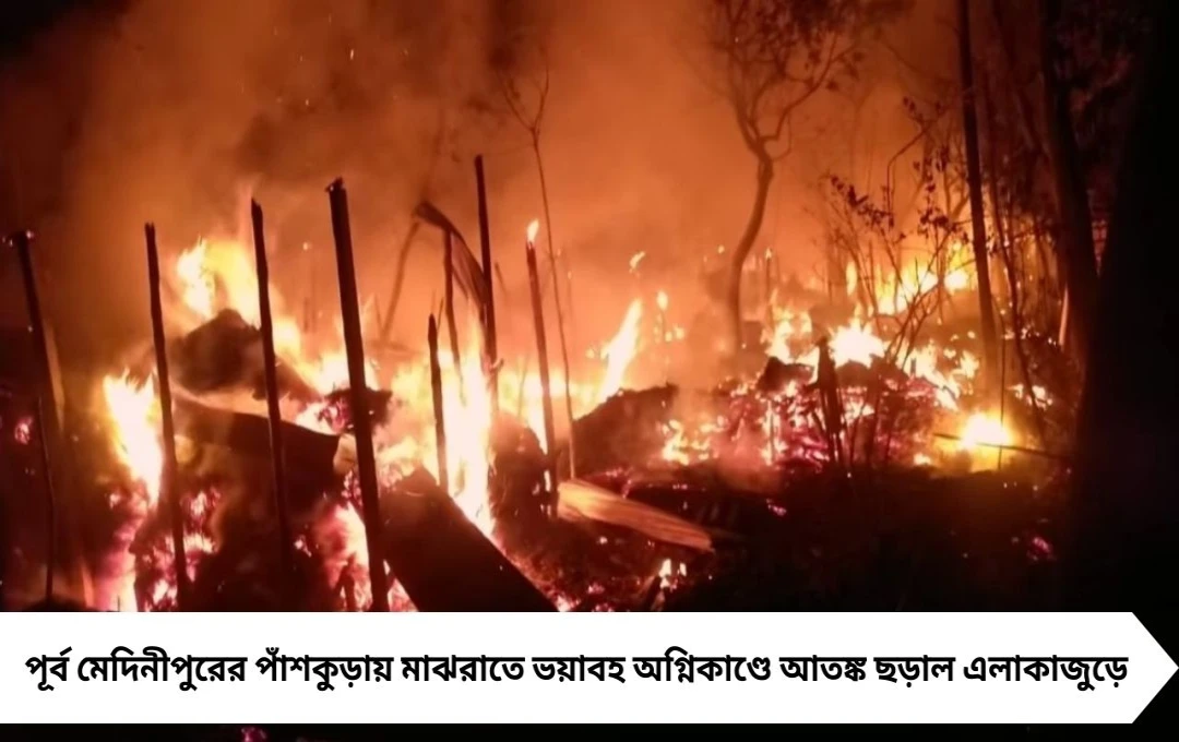 পূর্ব মেদিনীপুরের পাঁশকুড়ায় মাঝরাতে ভয়াবহ অগ্নিকাণ্ডে আতঙ্ক ছড়াল এলাকাজুড়ে। গোবিন্দনগর এলাকার মানুর গ্রামে বিষ্ণুপদ মণ্ডল নামে এক ব্যক্তির বাড়িতে আচমকাই আগুন ধরে যায়। মুহূর্তের মধ্যে আগুনের লেলিহান শিখা বাড়ির একাংশ গ্রাস করায় চরম আতঙ্কের সৃষ্টি হয় স্থানীয় বাসিন্দাদের মধ্যে।