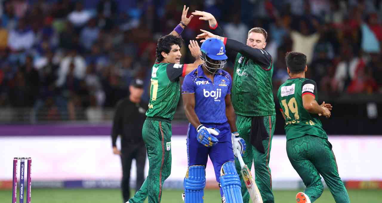 183 રનના લક્ષ્યનો પીછો કરવા ઉતરેલી MI એમિરેટ્સની શરૂઆત ખૂબ જ નબળી રહી. પાકિસ્તાનના ફાસ્ટ બોલર નસીમ શાહે પાવરપ્લેમાં જ બે મોટા ઝટકા આપીને મુંબઈની ઇનિંગને સંકટમાં મૂકી દીધી. ત્યારબાદ શાકિબ અલ હસન અને કીરોન પોલાર્ડે મધ્યક્રમમાં ટકી રહેવાનો પ્રયાસ કર્યો, પરંતુ ખુઝૈમા તનવીર અને ઉસ્માન તારીકની કસીને બોલિંગે રનની ગતિને રોકી દીધી.