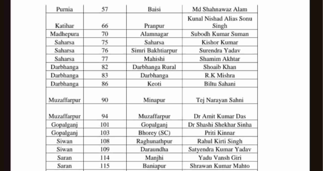 दरभंगा से आरके मिश्रा, मुजफ्फरपुर से प्रसिद्ध चिकित्सक अमन कुमार दास, रघुनाथपुर से राहुल कीर्ति सिंह और सहरसा से किशोर कुमार मुन्ना को टिकट दिया गया है।