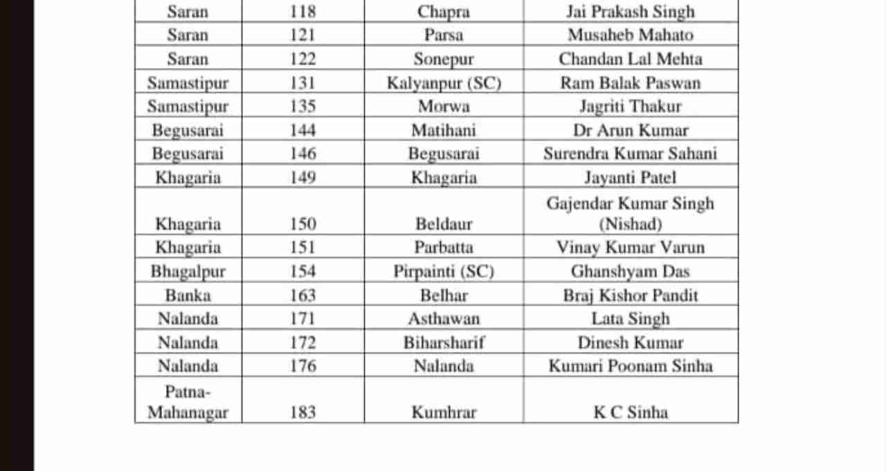 छपरा से जयप्रकाश सिंह, सोनपुर से चंदन लाल मेहता, मोतिहारी से डॉ. अरुण कुमार, केवटी से बिल्लू साहनी और हरसिद्धि से अवधेश राम भी मैदान में उतरेंगे। बिहारशरीफ से दिनेश कुमार और पटना की कुम्हरार सीट से केसी सिन्हा को प्रत्याशी बनाया गया है।