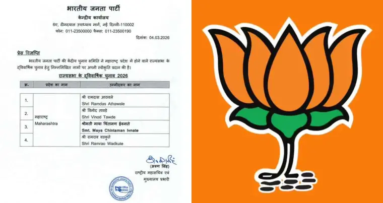 मुंबई: भारतीय जनता पार्टी (BJP) ने महाराष्ट्र से राज्यसभा चुनाव के लिए चार उम्मीदवारों की घोषणा कर दी है। पार्टी की केंद्रीय चुनाव समिति ने केंद्रीय मंत्री रामदास अठावले, भाजपा के राष्ट्रीय महासचिव विनोद तावड़े, समाजसेवी और आदिवासी नेता माया चिंतामण ईवनाते, और रामराव वाडकुटे को राज्यसभा उम्मीदवार के रूप में नामित किया है। यह घोषणा नई दिल्ली स्थित भाजपा के केंद्रीय कार्यालय द्वारा जारी प्रेस विज्ञप्ति में की गई।