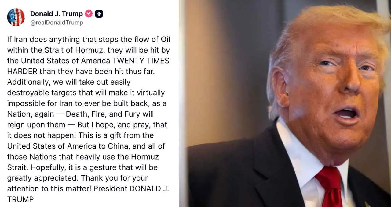 अमेरिकी राष्ट्रपति Donald Trump ने ईरान को चेतावनी दी है कि यदि Strait of Hormuz में तेल आपूर्ति रोकी गई तो अमेरिका 20 गुना तेज सैन्य कार्रवाई करेगा। मिडिल ईस्ट में बढ़ते तनाव के बीच यह बयान दिया गया।