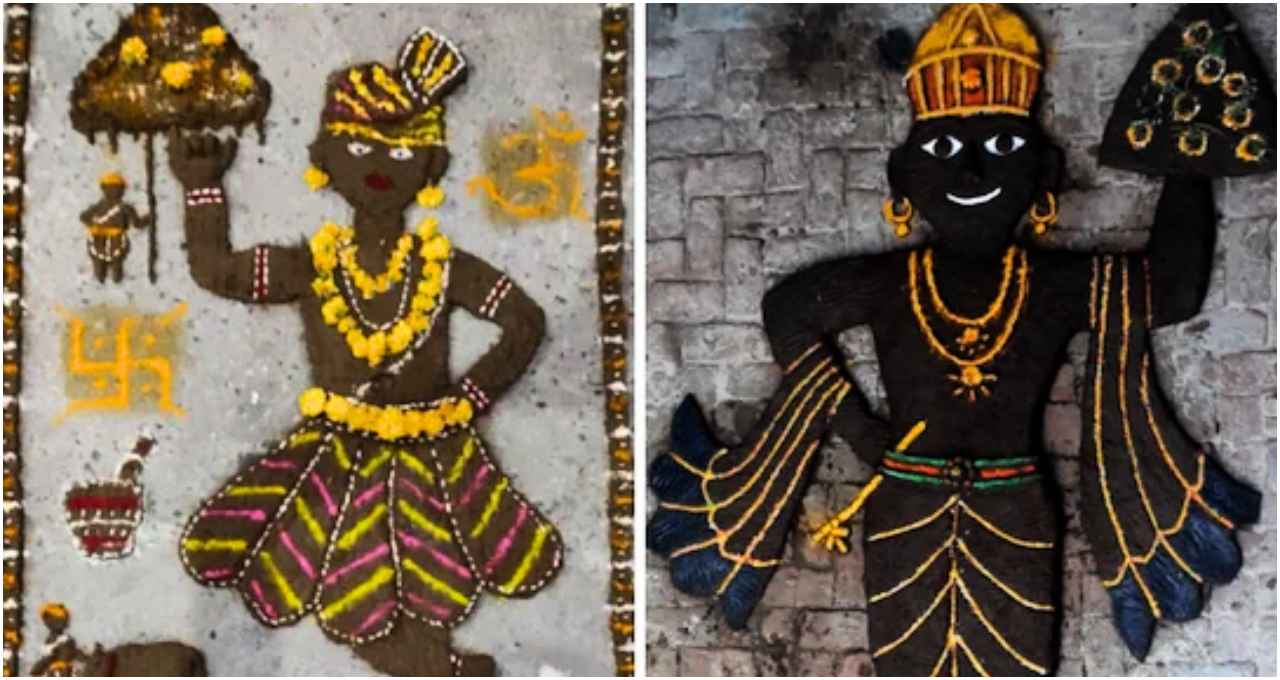 - सूखने दें और सजाएं: जब गोबर थोड़ा सूख जाए, तब उस पर कपड़ा और मुकुट पहनाएं। कुछ लोग रंगीन कपड़े या पत्तों से भी सजावट करते हैं।