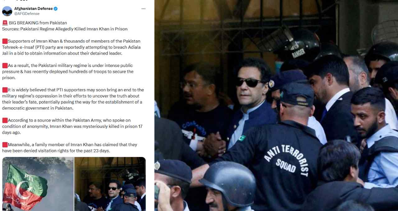 अफगानिस्तान के रक्षा मंत्रालय ने सोशल मीडिया प्लेटफॉर्म X पर दावा किया है कि उनके सूत्रों के अनुसार इमरान खान की जेल में हत्या कर दी गई है। अफगान रक्षा मंत्रालय ने कहा कि यह जानकारी उन्हें पाकिस्तानी सैन्य सूत्रों से मिली है जिन्होंने अपनी पहचान गुप्त रखने की बात कही है। उनके अनुसार करीब 17 दिन पहले इमरान खान को रहस्यमयी परिस्थितियों में मार दिया गया।