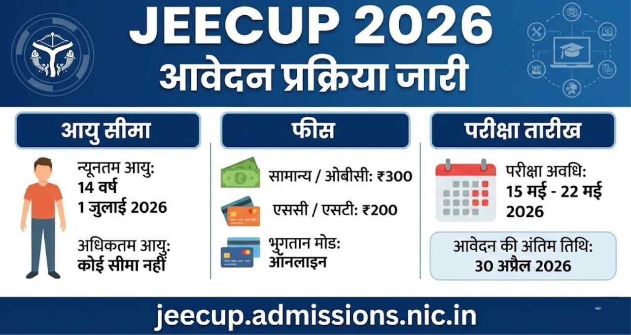 JEECUP 2026 के लिए आवेदन प्रक्रिया चालू है। न्यूनतम आयु 14 वर्ष तय की गई है। आवेदन की अंतिम तिथि 30 अप्रैल 2026 है, जबकि परीक्षा 15 से 22 मई 2026 के बीच CBT मोड में होगी।