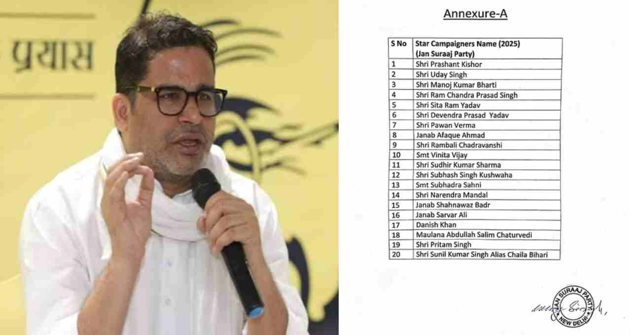 पटना: बिहार विधानसभा चुनाव 2025 की तैयारियों के बीच जन सुराज पार्टी ने शुक्रवार, 17 अक्टूबर को अपने 20 स्टार प्रचारकों की सूची जारी की। इस सूची में पार्टी के प्रमुख रणनीतिकार प्रशांत किशोर से लेकर लोकप्रिय नेता छैला बिहारी (सुनील कुमार सिंह) तक के नाम शामिल हैं। सूची में कई वरिष्ठ और नई राजनीतिक शख्सियतों का समावेश है, जो आगामी चुनाव में पार्टी के प्रचार अभियान को मजबूती देंगे।