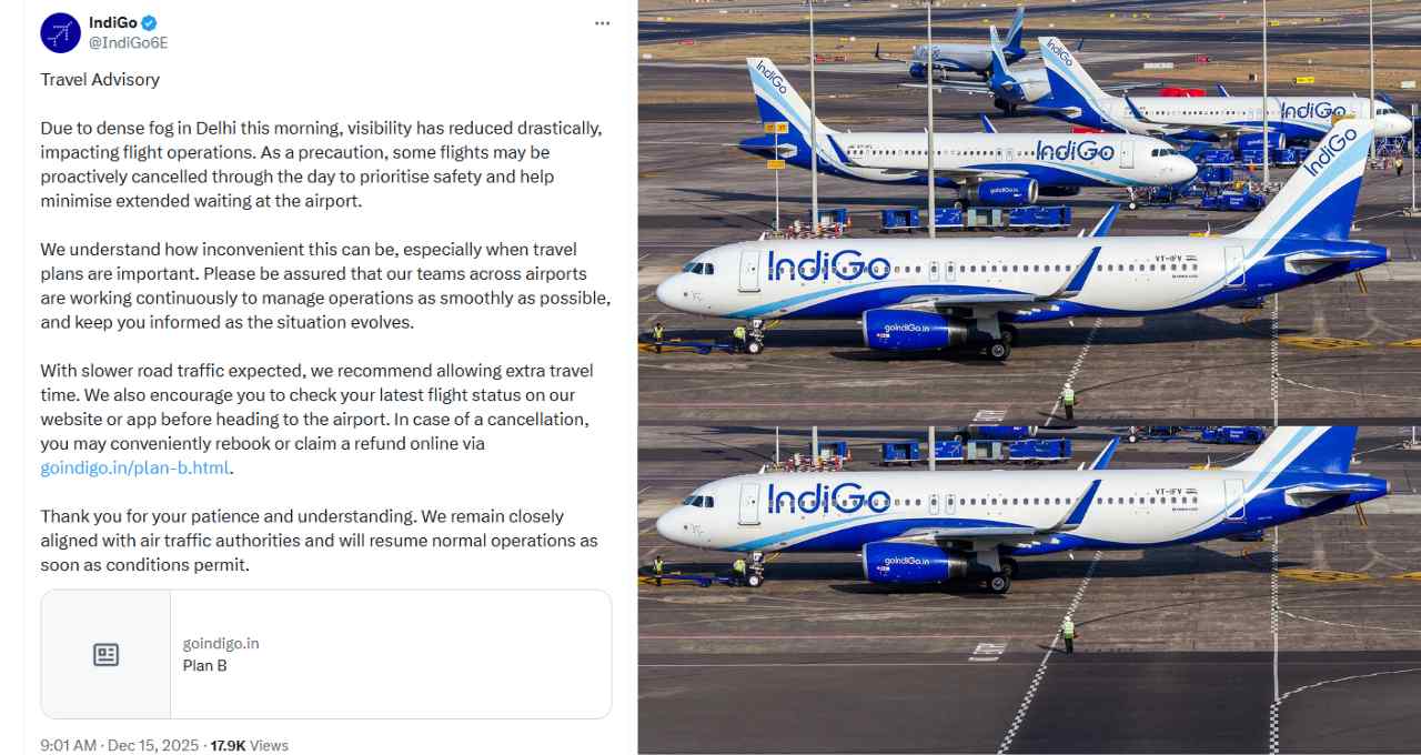 दिल्ली में घने कोहरे के कारण फ्लाइट प्रभावित हुईं। IndiGo ने प्लान-B पेश किया, जिससे यात्रियों को फ्लाइट कैंसिल या देरी पर रिफंड या रीबुकिंग बिना अतिरिक्त शुल्क मिल सकेगा।