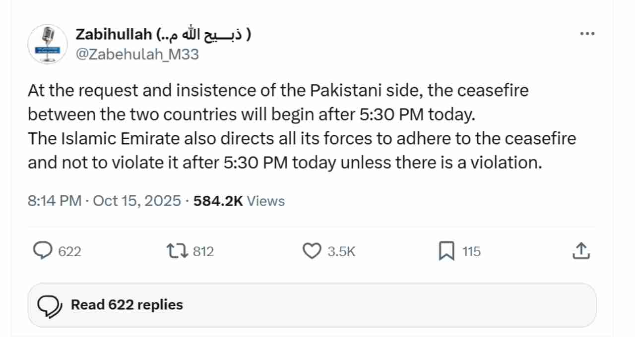 तालिबान सरकार के प्रवक्ता जबिउल्लाह मुजाहिद ने कहा कि पाकिस्तान के अनुरोध पर बुधवार शाम 5.30 बजे से दोनों देशों के बीच युद्धविराम लागू कर दिया गया है। मुजाहिद ने बताया कि तालिबान ने अपने सुरक्षाबलों को युद्धविराम का सख्ती से पालन करने के निर्देश दिए हैं।