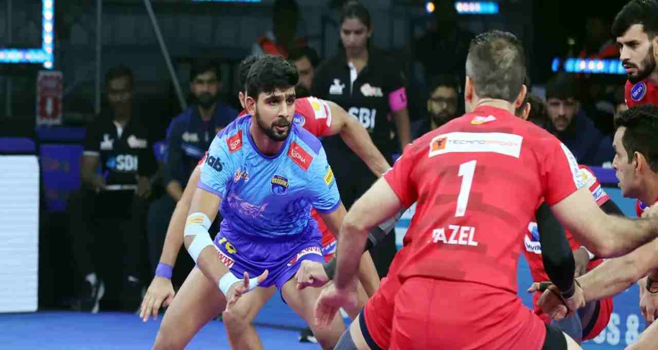 स्पोर्ट्स न्यूज़: प्रो कबड्डी लीग (PKL) के 12वें सीजन के 73वें मैच में बंगाल वारियर्स ने दबंग दिल्ली केसी को रोमांचक मुकाबले में 37-36 से हराया। मैच का निर्णय अंतिम सेकेंड में हुआ। यह दिल्ली की 13 मैचों में दूसरी हार है, जबकि बंगाल को 11 मैचों में चौथी जीत मिली है। जवाहरलाल नेहरू स्टेडियम में खेले गए इस मुकाबले में बंगाल की जीत में देवांक दलाल ने 12 अंकों के साथ अहम भूमिका निभाई। वहीं, हिमांशु ने 6 अंकों के साथ उनका शानदार साथ दिया।