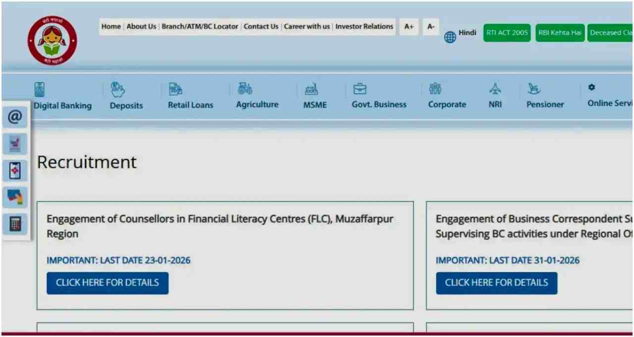 सेंट्रल बैंक ऑफ इंडिया ने 350 पदों पर भर्ती का ऐलान किया है। इसमें 300 मार्केटिंग ऑफिसर और 50 फॉरेन एक्सचेंज ऑफिसर के पद शामिल हैं। ऑनलाइन आवेदन प्रक्रिया 20 जनवरी 2026 से शुरू हो चुकी है। योग्य उम्मीदवार परीक्षा, अनुभव और इंटरव्यू के आधार पर चयन के लिए आवेदन कर सकते हैं।