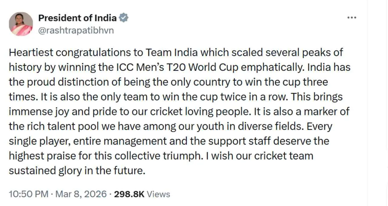 राष्ट्रपति ने कहा कि टीम इंडिया लगातार दो बार यह खिताब जीतने वाली भी पहली टीम बन गई है। उन्होंने इस उपलब्धि को भारतीय क्रिकेट के लिए बेहद गर्व का क्षण बताया। उनके अनुसार इस जीत ने देश के करोड़ों क्रिकेट प्रेमियों को खुशी और गर्व का अनुभव कराया है।