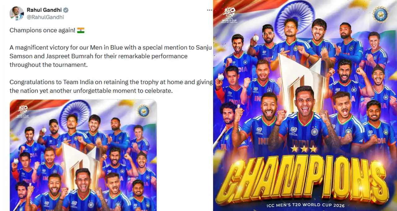 लोकसभा में विपक्ष के नेता Rahul Gandhi ने भी टीम इंडिया की जीत पर सोशल मीडिया के जरिए बधाई दी। उन्होंने अपने संदेश में लिखा कि भारत एक बार फिर चैंपियन बन गया है। राहुल गांधी ने कहा कि पूरे टूर्नामेंट में भारतीय टीम ने शानदार प्रदर्शन किया। उन्होंने खास तौर पर Sanju Samson और Jasprit Bumrah के प्रदर्शन की तारीफ की।
