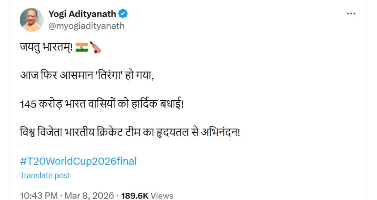 उत्तर प्रदेश के मुख्यमंत्री Yogi Adityanath ने भी टीम इंडिया की जीत पर बधाई दी। उन्होंने कहा कि आज पूरे देश के लिए गर्व का दिन है और भारतीय टीम ने एक बार फिर देश का नाम रोशन किया है।
