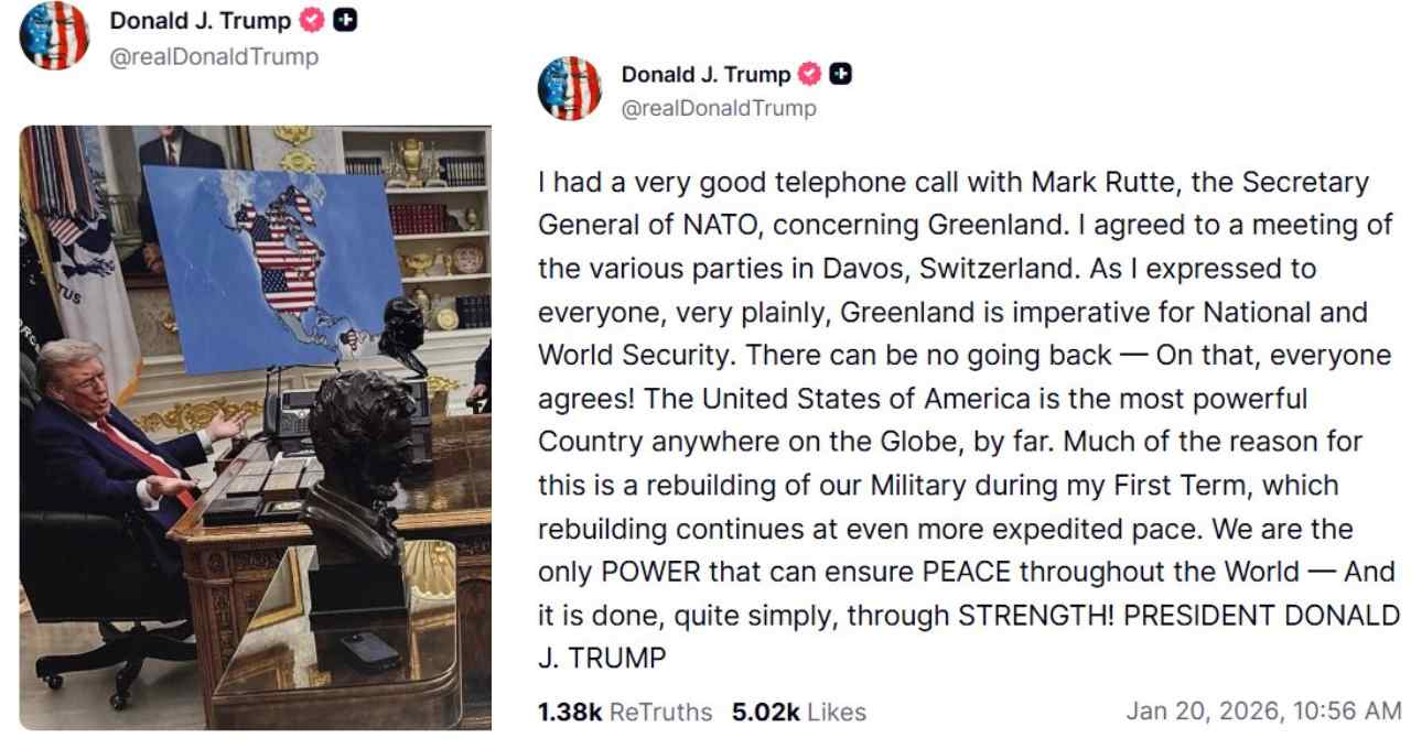 डोनाल्ड ट्रंप ने एक पोस्ट में यह भी दावा किया कि उन्होंने नाटो के प्रमुख से फोन पर बातचीत की है। ट्रंप के अनुसार इस बातचीत में ग्रीनलैंड को लेकर चिंता जताई गई और आगे की रणनीति पर चर्चा हुई।