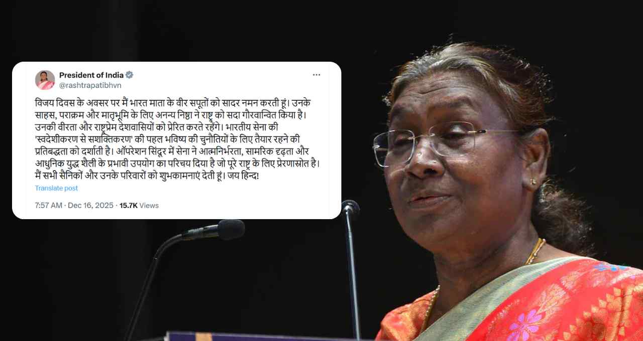 विजय दिवस के अवसर पर राष्ट्रपति द्रौपदी मुर्मू ने सोशल मीडिया प्लेटफॉर्म एक्स पर भावुक संदेश साझा किया। उन्होंने भारत माता के वीर सपूतों को सादर नमन करते हुए कहा कि उनके साहस, पराक्रम और मातृभूमि के प्रति अनन्य निष्ठा ने राष्ट्र को हमेशा गौरवान्वित किया है।