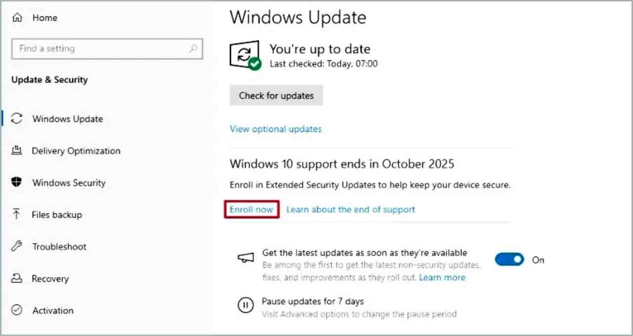 अगर सब ठीक है तो Windows Update सेक्शन में Windows 10 support ends in October 2025 संदेश दिखाई देगा। Enroll in Extended Security Updates लिंक पर क्लिक करके आप OneDrive बैकअप, $30 भुगतान या 1,000 Rewards Points में से किसी एक विकल्प को चुन सकते हैं। कुछ सिस्टम्स में यह विकल्प धीरे-धीरे उपलब्ध हो रहा है।