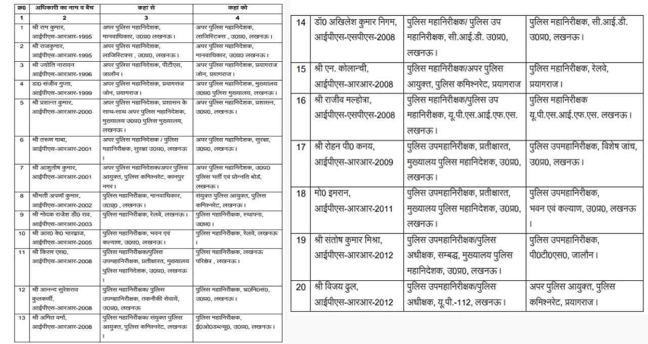 एन कोलांची को आईजी रेलवे प्रयागराज बनाया गया है। राजीव मल्होत्रा को आईजी यूपी एसएफआईएस लखनऊ नियुक्त किया गया है। रोहन पी कनय को डीआईजी विशेष जांच लखनऊ बनाया गया है। मोहम्मद इमरान को डीआईजी भवन एवं कल्याण लखनऊ की जिम्मेदारी सौंपी गई है। संतोष कुमार मिश्र को डीआईजी पीटीएस जालौन बनाया गया है।