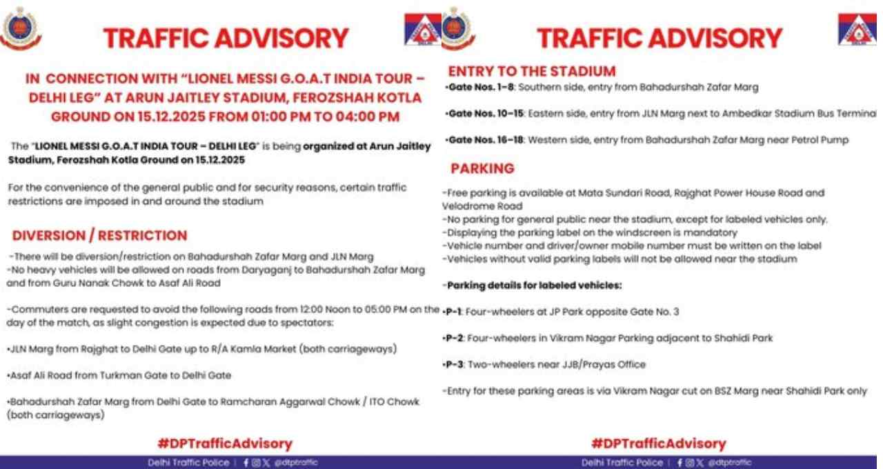 கால்பந்து நட்சத்திரம் லியோனல் மெஸ்ஸி இன்று டெல்லிக்கு வருகை. அருண் ஜெட்லி ஸ்டேடியம் அருகே போக்குவரத்து திருப்பிவிடல், வாகன நிறுத்தம் தடை. மாற்று வழிகள் மற்றும் பொதுப் போக்குவரத்தைப் பயன்படுத்த ரசிகர்களுக்கு காவல்துறை வேண்டுகோள்.