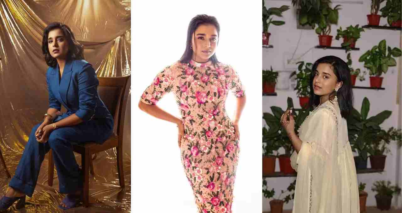 - வெளிர் மஞ்சள் ஃப்ளேர்டு சூட்: வெளிர் மஞ்சள் ஃப்ளேர்டு சூட், திறந்த முடி மற்றும் சிறிய காதணிகள் சும்பூலுக்கு எளிமையான மற்றும் நேர்த்தியான தோற்றத்தை அளித்துள்ளன. இந்த உடை அலுவலகத்திற்கோ அல்லது சாதாரண வெளியூர் பயணத்திற்கோ ஏற்றது.