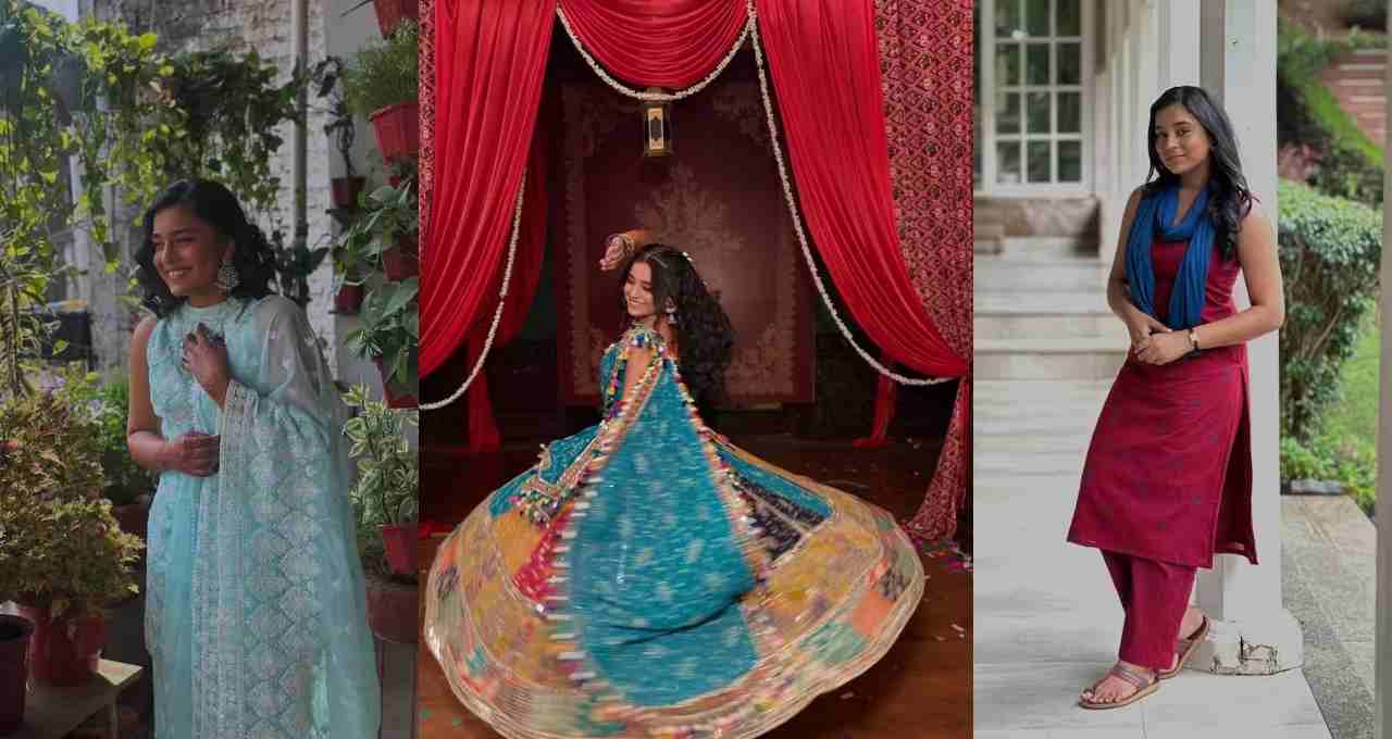- மல்டிகலர் மிரர்-வொர்க் லெஹங்கா சோலி: இந்த தோற்றத்தில் சும்பூல் மல்டிகலர் மிரர்-வொர்க் லெஹங்கா சோலி அணிந்துள்ளார். திறந்த சுருண்ட முடி மற்றும் பொருந்தும் நகைகளுடன் அவரது பண்டிகைக் கால மனநிலை மிகவும் சிறப்பாகத் தெரிகிறது.